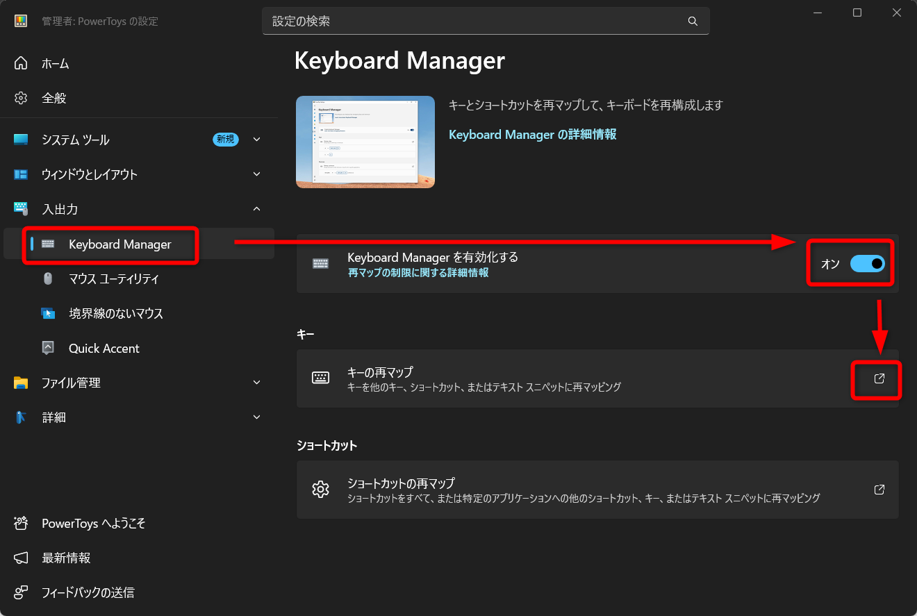 - Keyboard Managerを有効化する。